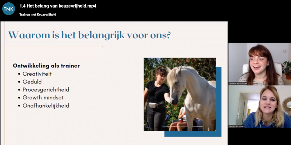 In deze presentatie van 40 minuten lang leggen Janneke en Jessica je het belang van keuzevrijheid uit voor jou en je paard. Je leert niet alleen waarom het cruciaal is voor de gezondheid en het welzijn van je paard, maar ook hoe het de training en jullie onderlinge vriendschap versterkt. Het begrip keuzevrijheid gaat verder dan enkel de dagelijkse omgang; het beïnvloedt de manier waarop je paard leert, reageert en communiceert. Je zult ontdekken hoe het bieden van keuzes je paard zelfverzekerder en gelukkiger maakt. Tijdens deze sessie laten Janneke en Jessica zien hoe je praktische toepassingen van keuzevrijheid kunt integreren in je dagelijkse routines. Of het nu gaat om kleine beslissingen zoals de volgorde van oefeningen, of grotere keuzes zoals het type training dat je aanbiedt, elke keuze heeft een positieve impact op de relatie met je paard. Je zult verbaasd zijn over de subtiele maar diepe veranderingen die ontstaan wanneer je paard voelt dat het medezeggenschap heeft.
